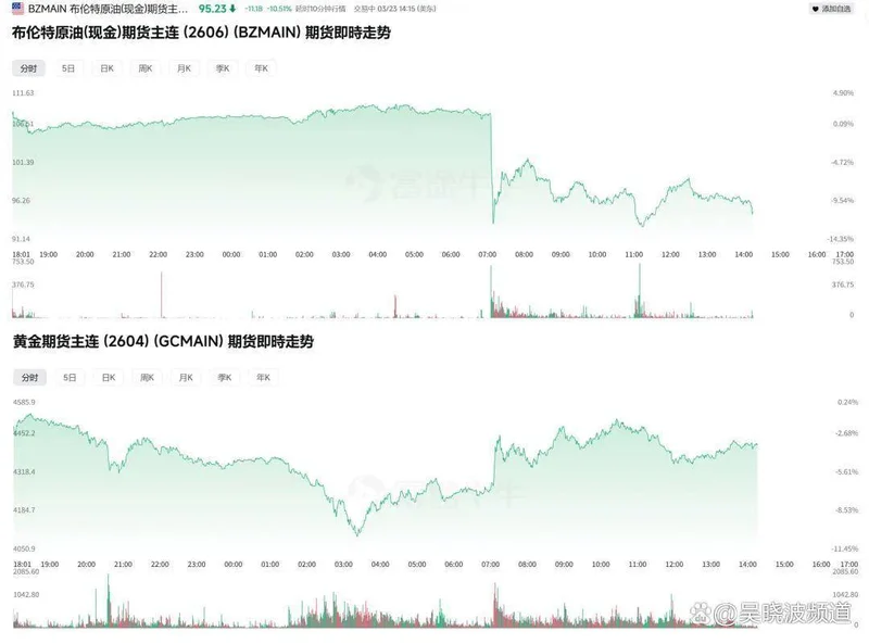 特朗普发完推文后,反应最快的是油价和黄金,布伦特原油现货从113美元/桶高位暴跌超10%,一度跌破97美元/桶,WTI原油跌幅瞬间超过12%,最低跌破85美元/桶。