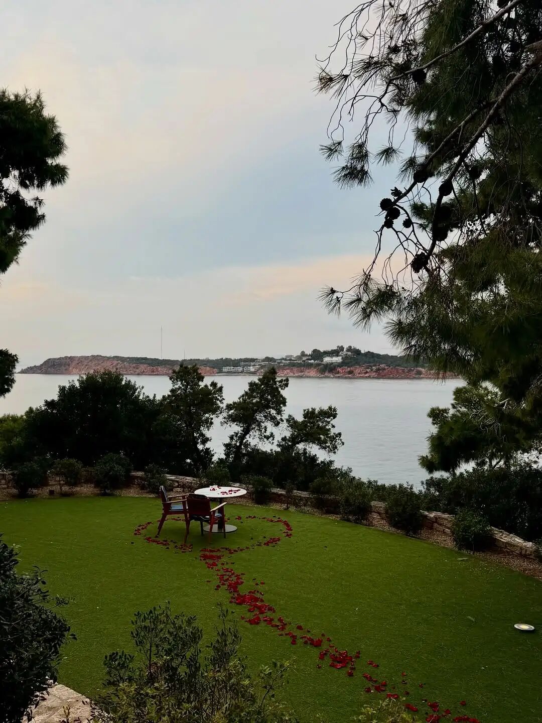求婚发生在希腊沃利亚格梅尼的一家顶级豪华酒店内。落日余晖下,巨大的心形玫瑰花阵、铺满烛光的小径,背景是碧波荡漾的海湾。