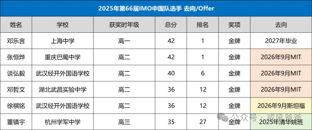 2025年IMO中国国家队总共有6名选手,最近海外名校放榜后,有人统计了他们的去向,然后发出感慨:IMO最差进清华姚班?