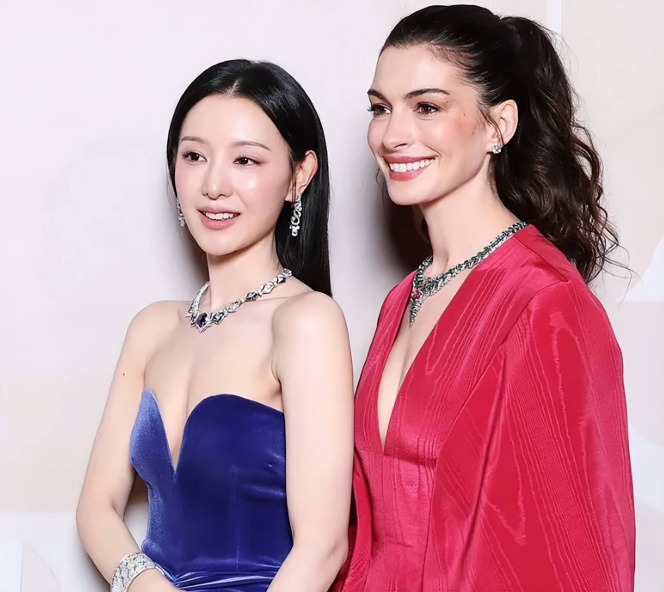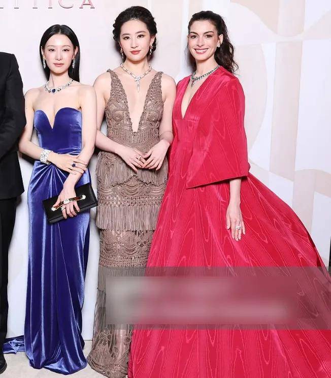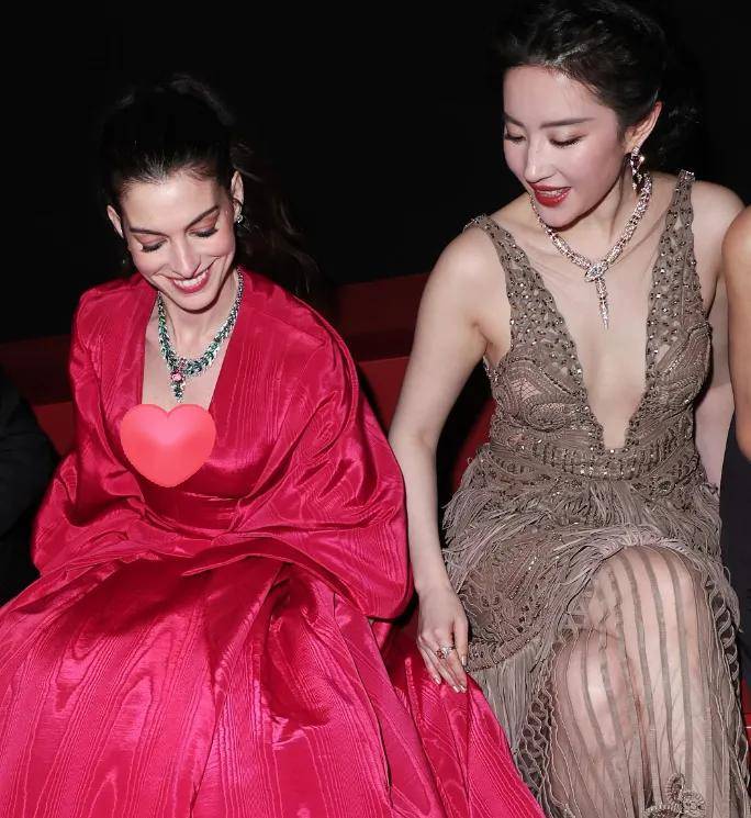 刘亦菲在内场和安妮海瑟薇同框,没有多余打光,同一视角下,海瑟薇笑起来又干瘪又显老,粉嫩的妆造也没能显年轻,太阳穴凹陷看着像假人一样。反倒旁边的刘亦菲侧着脸,镜头畸变下也能看出面色红润,元气满满。