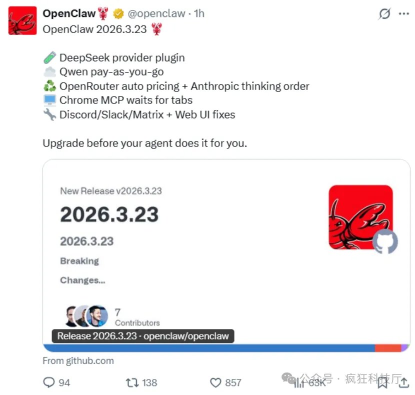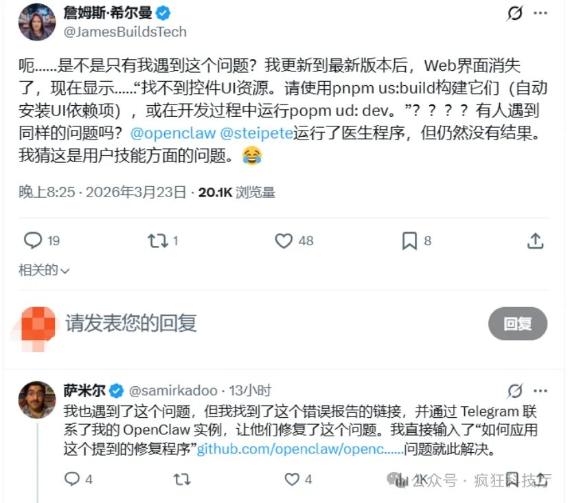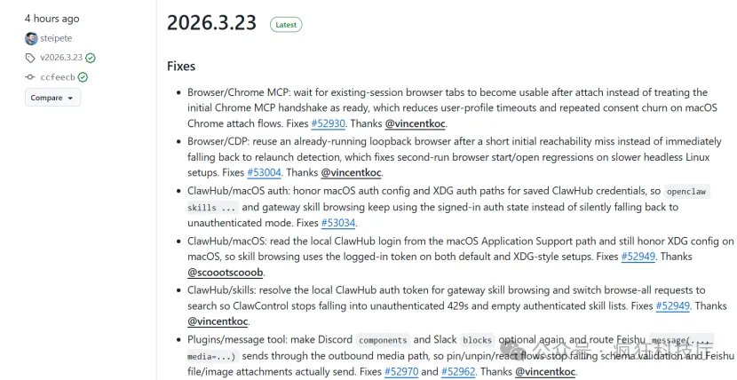 不到24小时,团队就推出v2026.3.23,一口气修复了数十个发布后才暴露的问题,主打一个“你提我改,态度诚恳”。