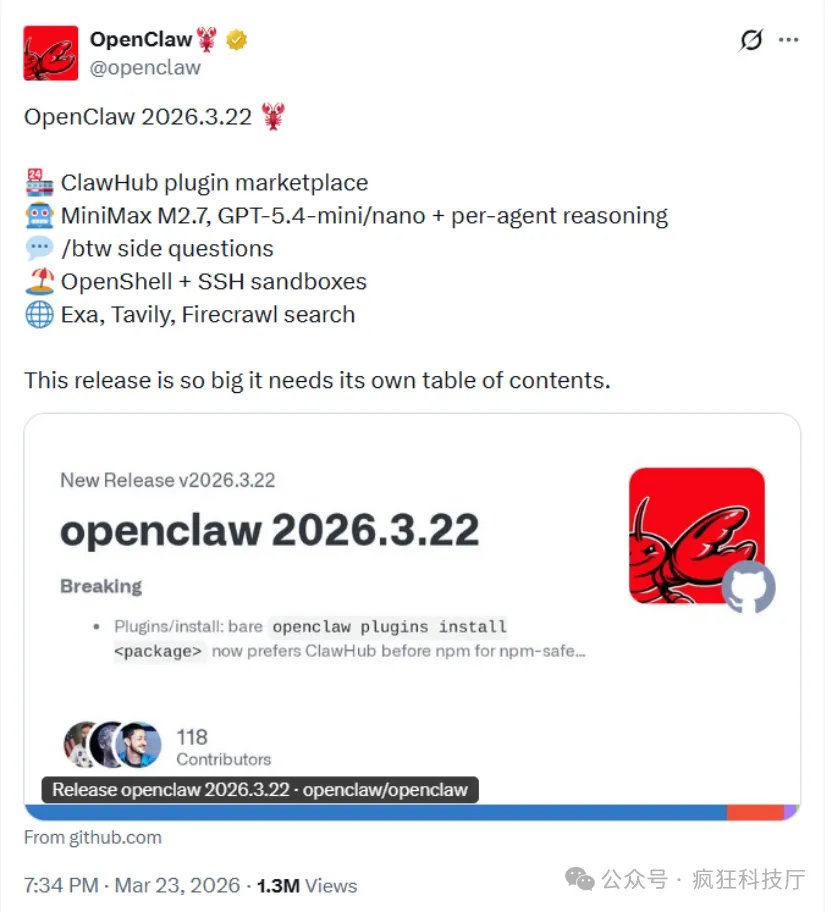 北京时间3月23日晚,GitHub上停更9天的OpenClaw终于官宣更新。