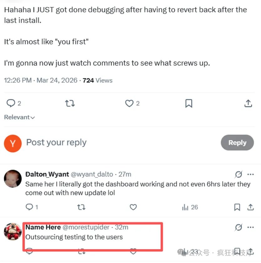 可即便补丁更新速度再快,也依旧挡不住网友们的“毒舌”:有网友戏称“这是把测试工作外包给用户了。”