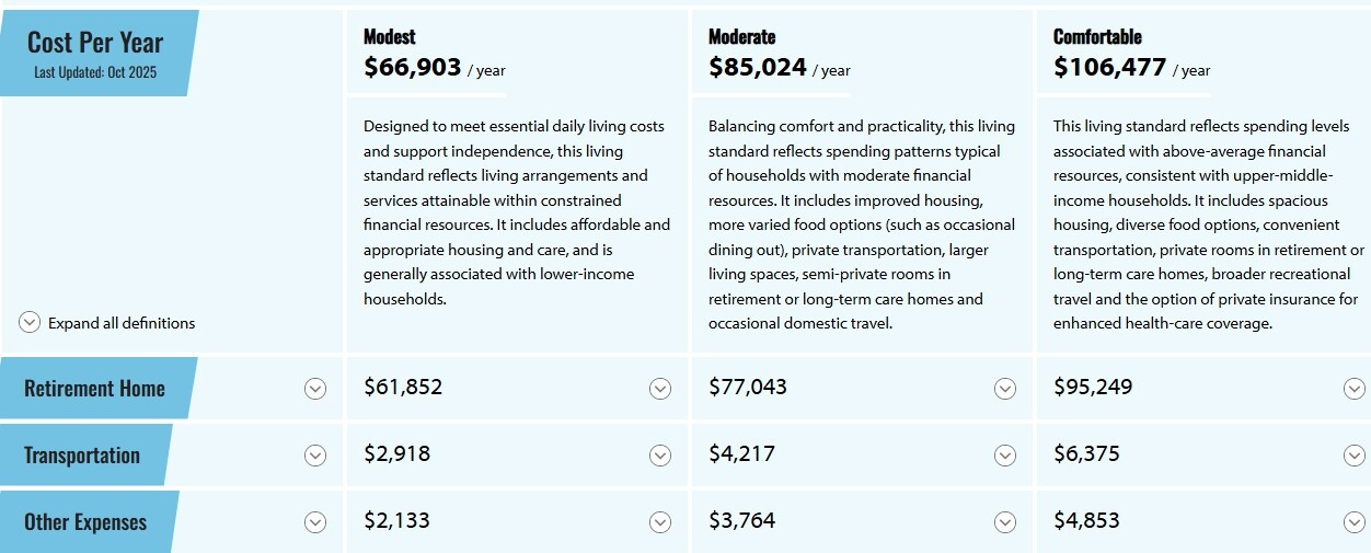 一项新的在线工具可以帮助解答这个问题。多伦多都会大学国家老龄研究所推出的“养老成本计算器”,可以根据不同生活方式(简约、中等、舒适),分别估算你在自住房、养老院以及长期护理机构的生活成本。