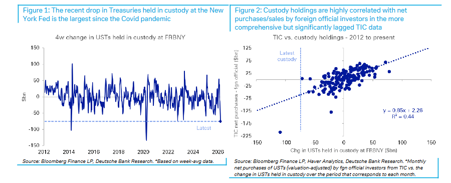 基于这一历史关系,750亿美元的托管持仓降幅对应的外国官方净抛售规模约为600亿美元。德意志银行指出,这将是自新冠疫情以来外国官方账户最大规模的净抛售,若追溯更早,则需回溯至2018年12月才有可比案例。