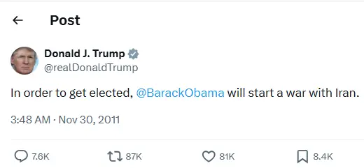 ▲2011年至2012年间,特朗普频繁在社交媒体和视频中指责时任总统奥巴马,认为他会为了提振支持率而对伊朗发动战争。