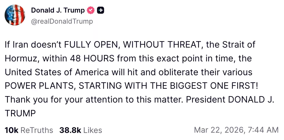 3月21日,川普对伊朗发出“最后通牒”:“如果伊朗不在从现在起48小时内『在毫无威胁的情况下,完全开放』霍尔木兹海峡,美国将打击并摧毁其多座发电厂,先从最大的一座开始!”