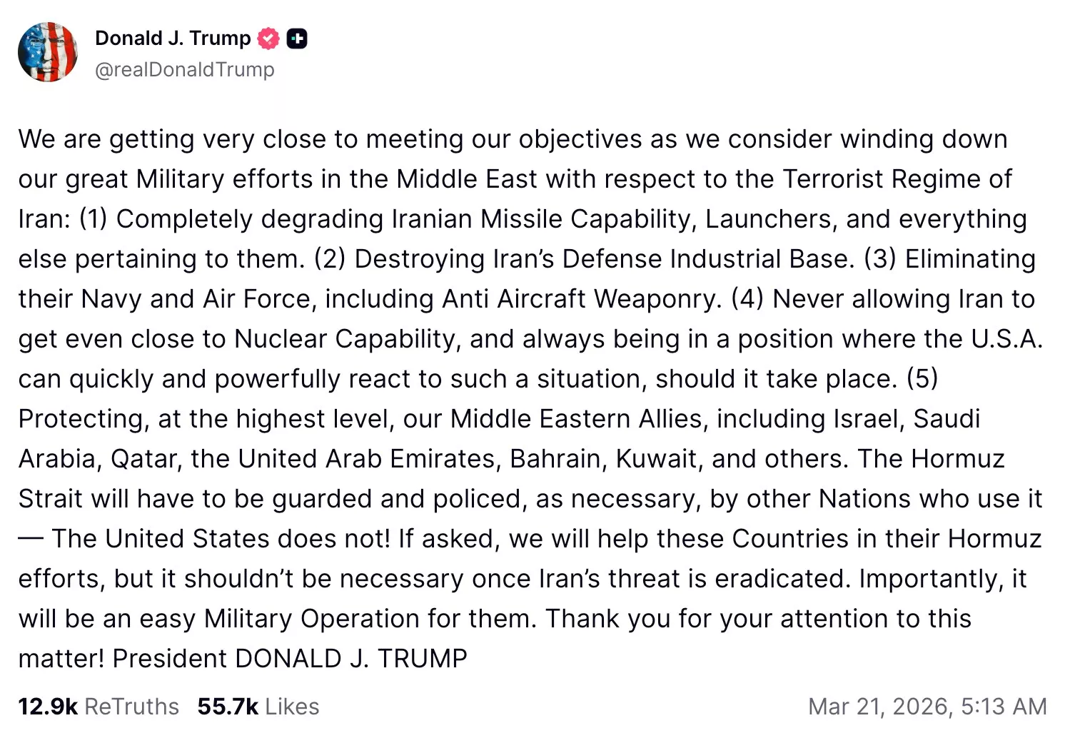 3月20日,川普在TruthSocial上声言:“我们正逐步达成既定目标,同时我们正在考虑为中东的伟大军事努力逐步收尾。”(网站截图)