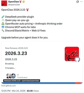 紧接着,今天中午,龙虾就紧急推出OpenClaw 2026.3.23版本,重点更新了DeepSeek插件、Qwen按量付费模式、OpenRouter自动定价、Anthropic思考顺序优化、Chrome MCP等待标签页加载以及Discord/Slack/Matrix及Web界面修复等内容。