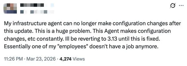 有网友称,升级后,他的基础结构Agent不能再进行配置更改,变得无法使用,他不得不回滚到OpenClaw 2026.3.13版本。