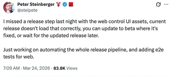 今早,“小龙虾之父”Peter Steinberger发文承认,他在昨晚发布3.22版小龙虾时遗漏了Web控制界面资源的一个步骤,当前版本无法正确加载该部分。