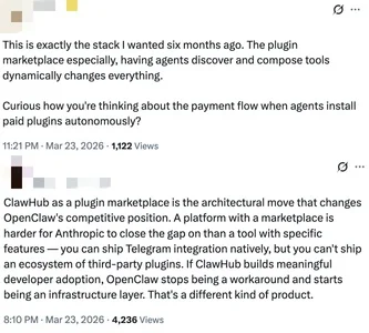 9天本来不久,但龙虾之前的更新速度几乎是一天一更,所以3.22的更新算是憋了个大招,广大小龙虾用户们对此也十分期待。不少网友都提到了3.22版更新的ClawHub插件市场,将其赞誉为“一项足以改变OpenClaw竞争格局的架构级动作。”