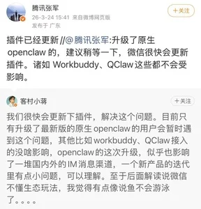 对此,微博中有微信员工发文回应称:“我们很快会更新下插件,解决这个问题。目前只有升级了最新版的原生OpenClaw的用户会暂时遇到这个问题,其他比如workbuddy、QClaw接入的没啥影响。”