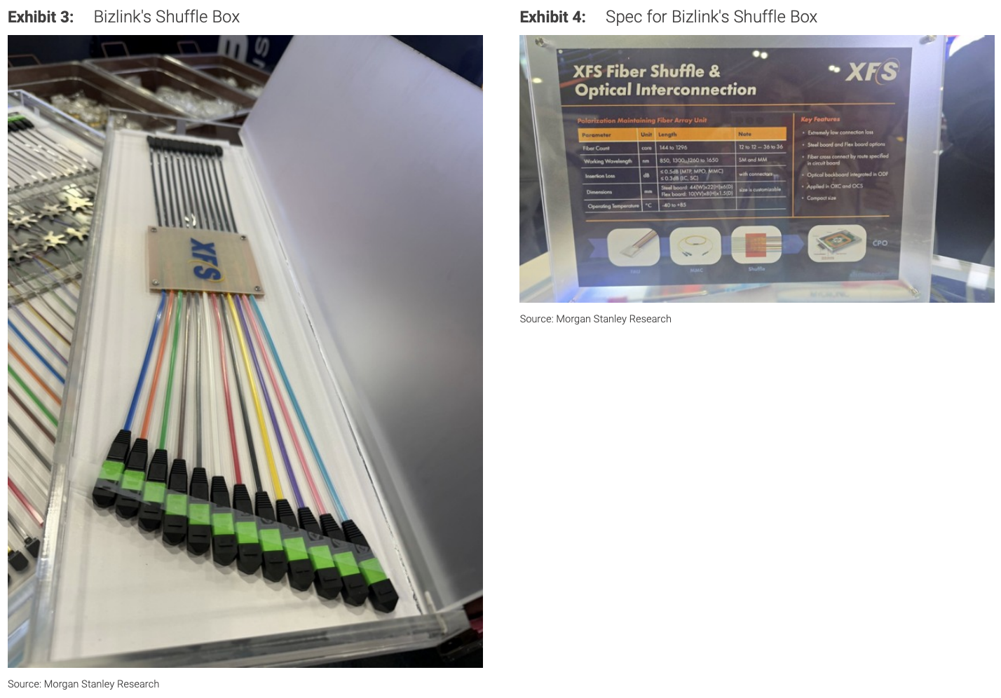 Bizlink在本届OFC上的展台印证了这一逻辑。除与Credo合作深耕AEC业务外,该公司还展示了FAU(光纤阵列单元)耦合模块和Shuffle Box组件。据摩根士丹利渠道调研,Bizlink可能还在与Credo合作开发ALC(有源LED电缆)和光模块产品,显示其正积极向光学解决方案延伸。