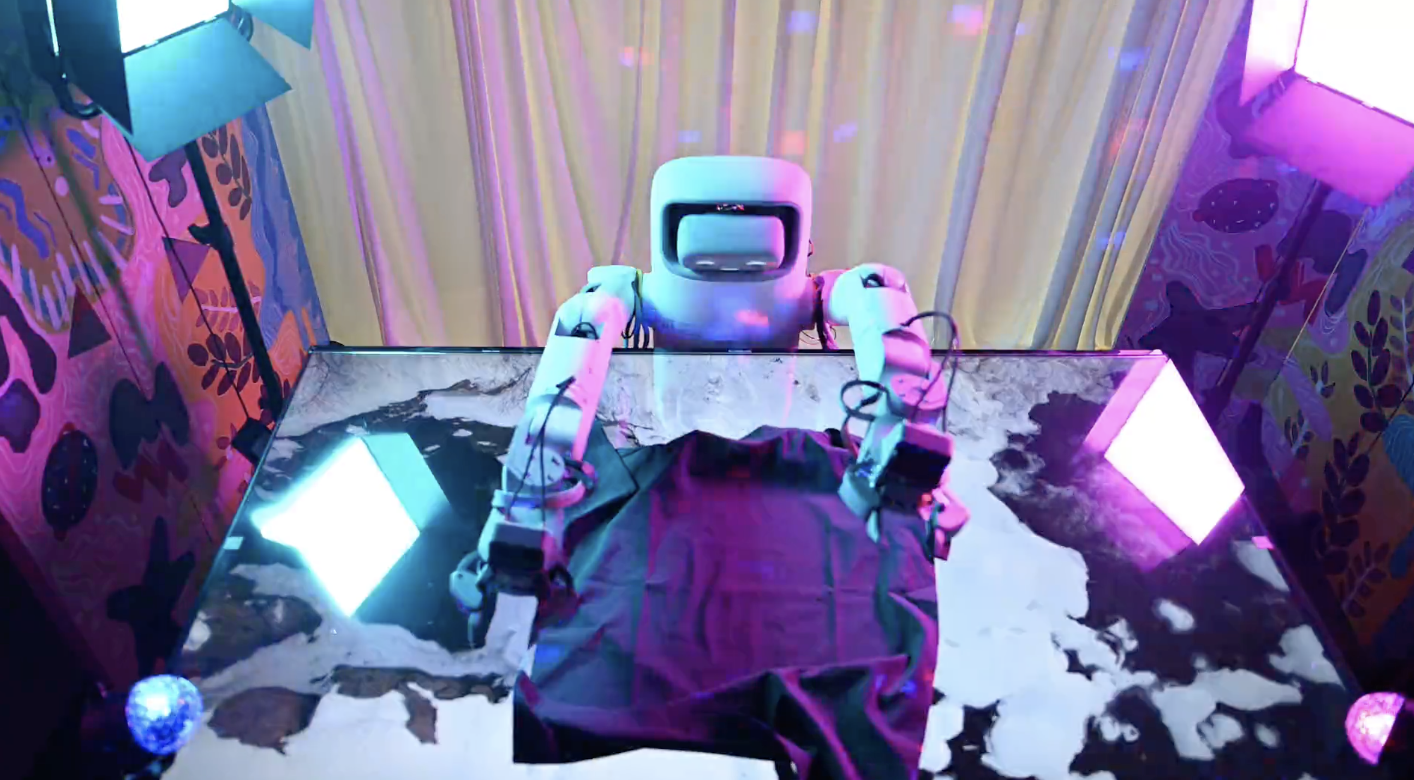下面这个视频里,机器人站在一台正在播放画面的电视机前叠衣服。