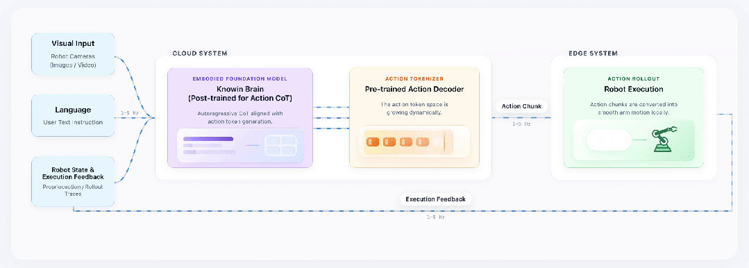 输入端整合机器人摄像头视觉数据、用户文本指令与本体状态反馈,以1-5Hz的频率同步输入云端KnowinBrain具身基座。