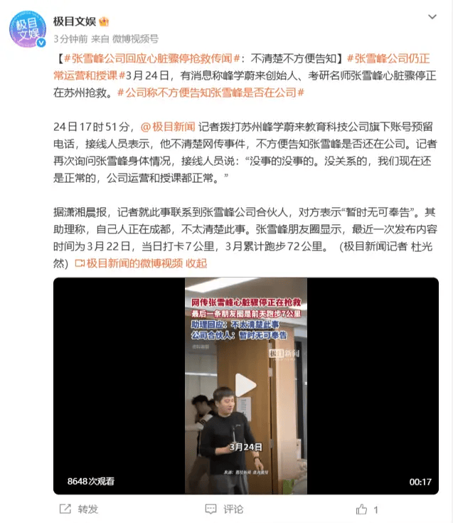 3月24日傍晚,网传张雪峰心脏骤停正在苏州抢救。潇湘晨报记者就此事联系到张雪峰公司合伙人,对方表示“暂时无可奉告”。17时51分,极目新闻记者拨打苏州峰学蔚来教育科技公司旗下账号预留电话,接线人员表示,他不清楚网传事件,不方便告知张雪峰是否还在公司。记者再次询问张雪峰身体情况,接线人员说:“没事的没事的。没关系的,我们现在还是正常的,公司运营和授课都正常。”
