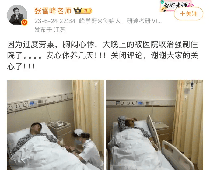2023年,张雪峰就曾因过度劳、累胸闷心悸被强制住院。