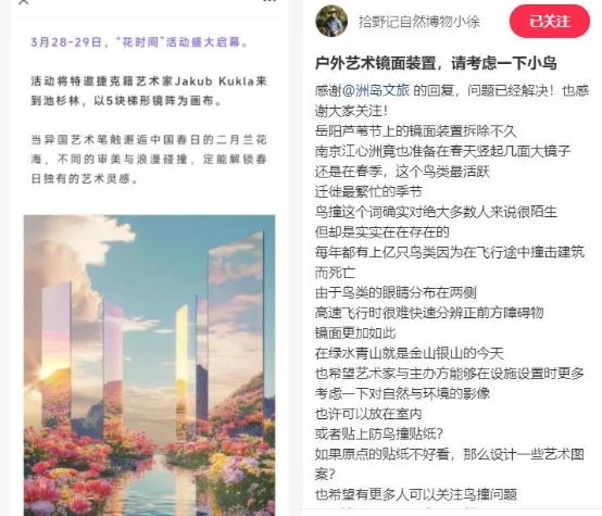对于这场即将亮相的网红展,市民游客看法也各不相同。有人觉得,镜面反射花海林木,拍照出片、氛围感拉满,是很好的景观装饰;也有人理性表态,过高的镜面不仅影响林间采光,鸟儿看到倒影也容易受惊,产生视觉错觉,打扰鸟类正常栖息,得不偿失。