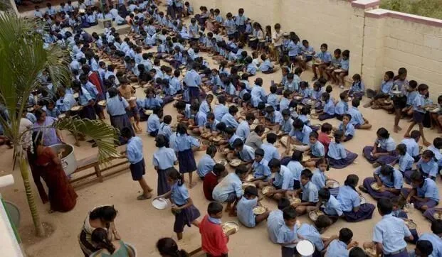 印度学生坐在简陋的“操场”上吃午饭因为他们的学校没有食堂