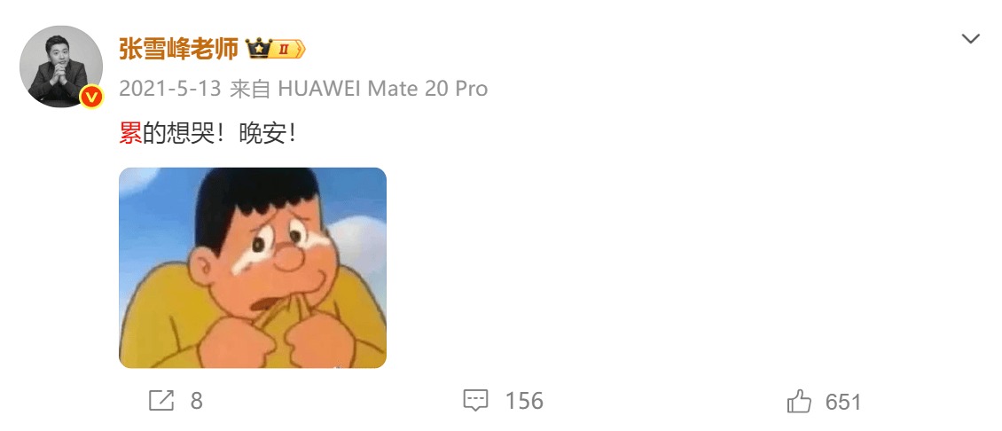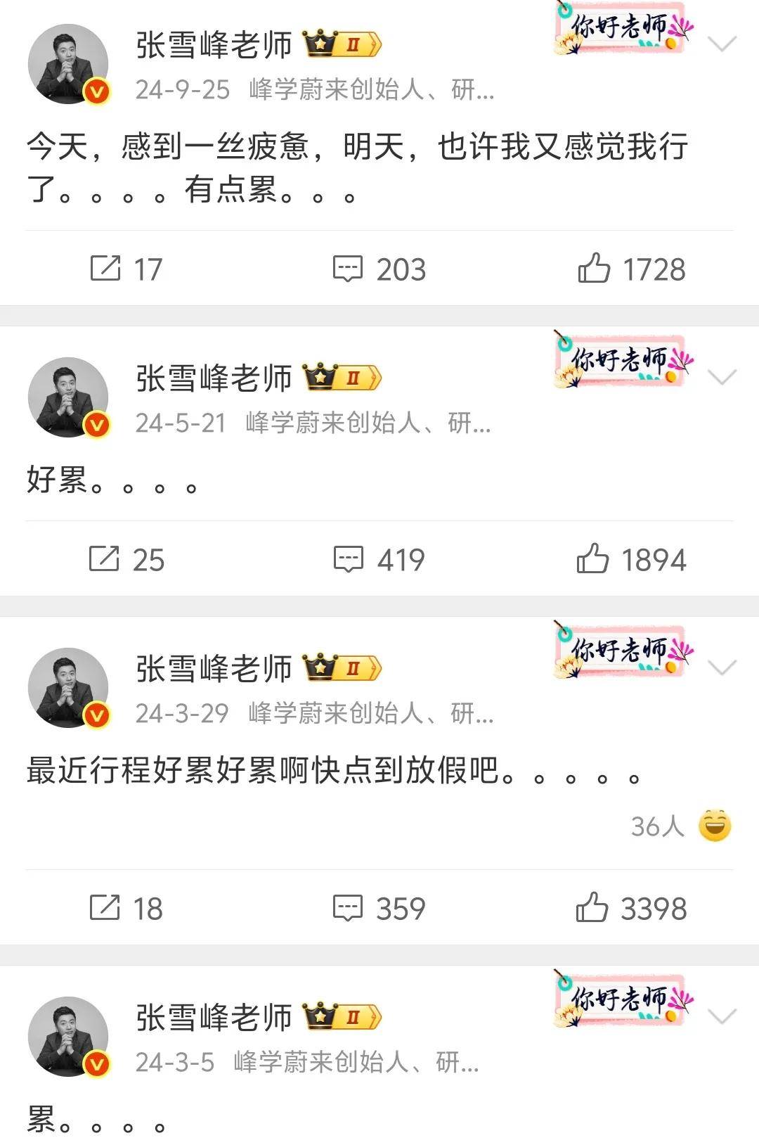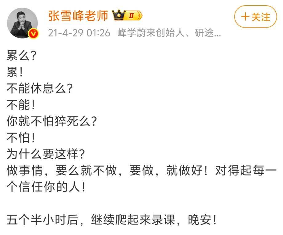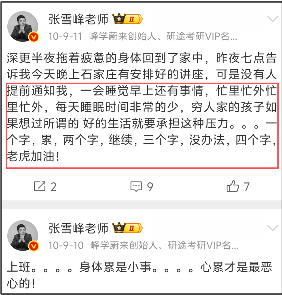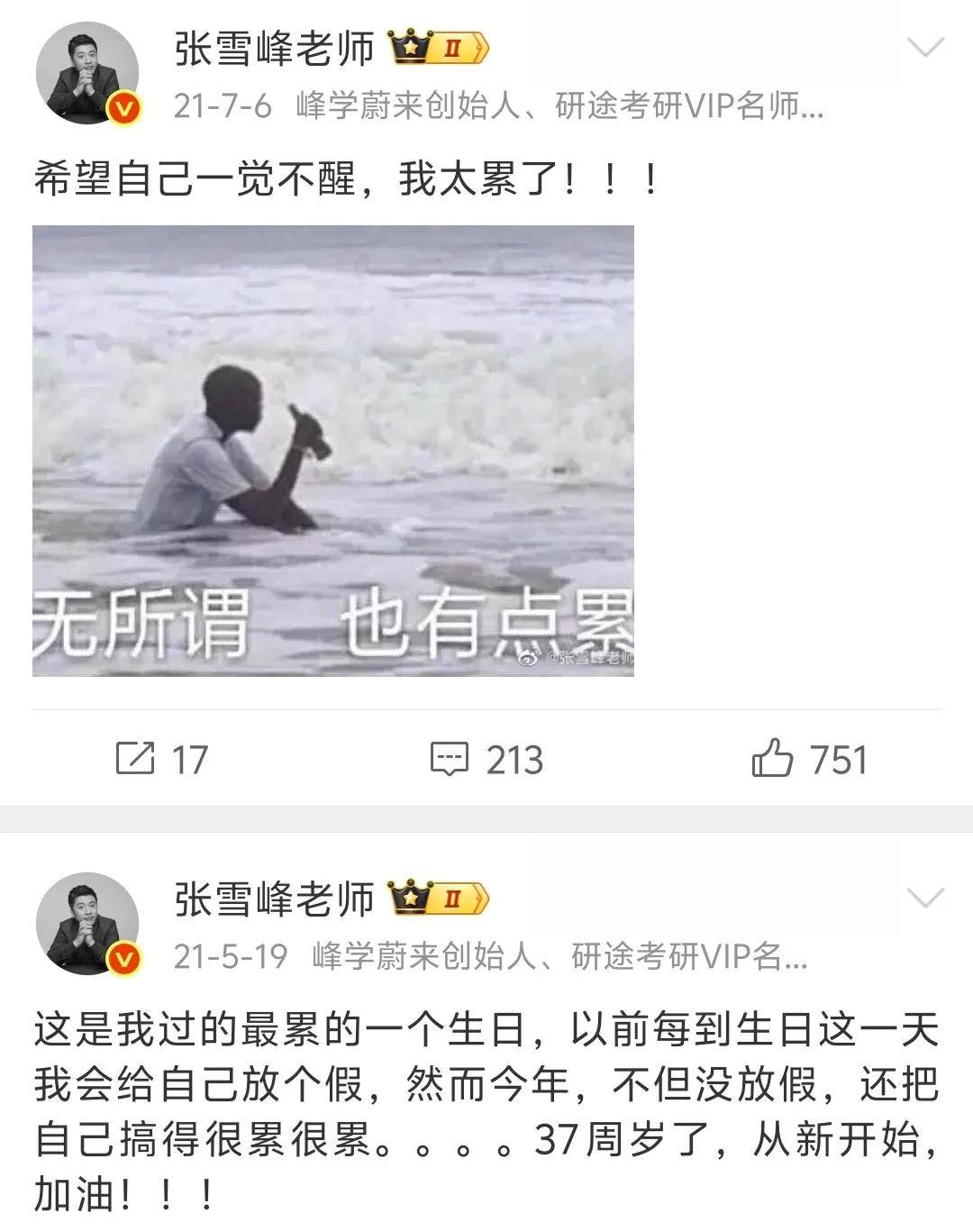 十几年时间,张雪峰发了几十条喊累的微博,早年没日没夜到处跑线下讲座,累到不想生活,累到想哭,走红之后,工作量更大了,连过生日都觉得累。