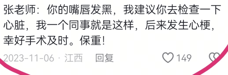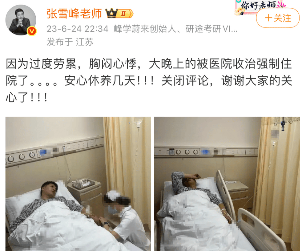 时间再往前数,2023年,张雪峰因为过度劳累胸闷心悸被强制住院,同年,有网友在评论区提醒他注意心脏问题。
