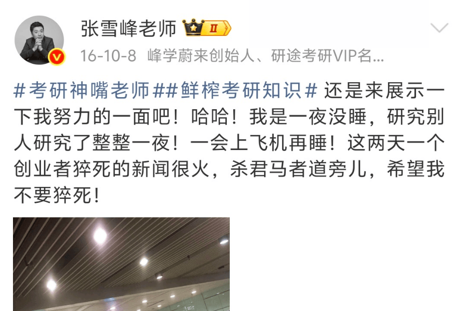 2016年,张雪峰微博第一次出现了“猝死”两个字,他一夜没睡,坐在机场担忧着、感慨着,希望自己不要猝死。