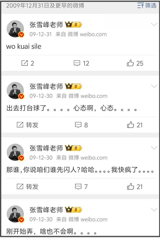 张雪峰从2009年起,也就是17年前,就开始使用微博了,使用微博第二天,张雪峰就发了一条“wo kuai sile”。