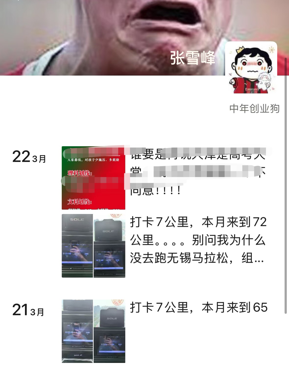 不过,后来张雪峰一直在积极锻炼,经常会在朋友圈发跑步打卡的内容,最后一条更朋友圈更新于3月22日,打卡7公里,3月份累计跑了72公里,并透露自己没去跑无锡马拉松。