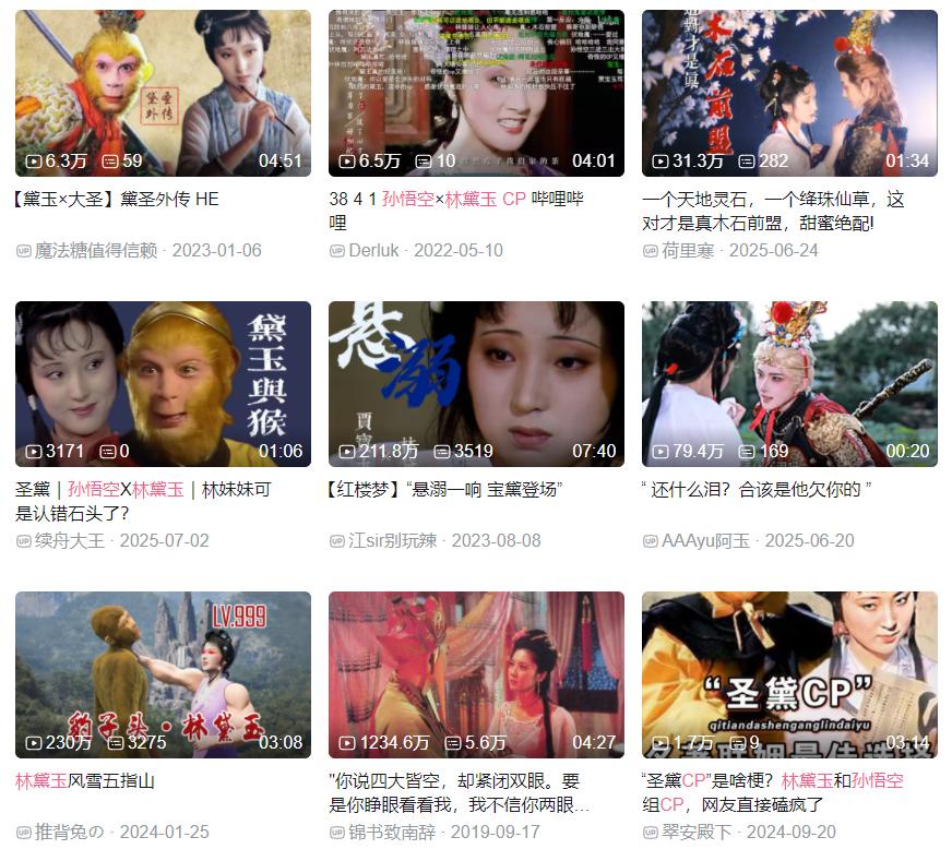 这其中,“拉郎配”成为了“邪门CP”中最具网感的一大分支——跨IP、跨物种CP。视频网站中最具代表性的“拉郎配”非“林黛玉X孙悟空”莫属,二者凭着“清冷才女与桀骜猴王”的反差,创下了超1亿的二创剪辑播放量。类似这样的CP还有很多,如“伏地魔X林黛玉”“迪迦奥特曼X林黛玉”“孙悟空X佟湘玉”等,主打一个不疯魔不成活——只有你想不到的,没有网友脑洞不出来的。