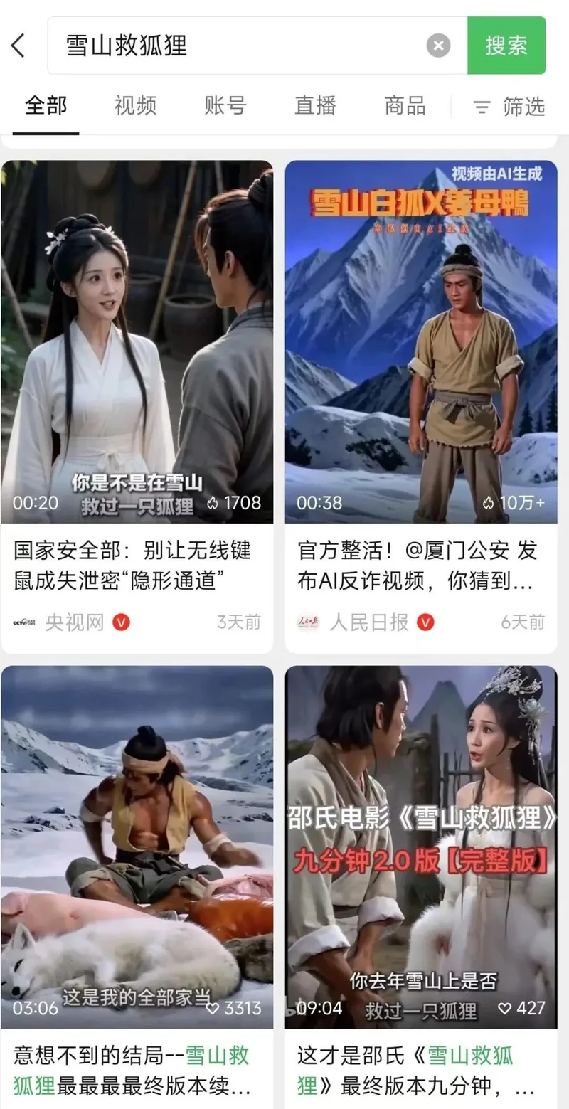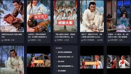 另一边是邵氏版“雪山救狐狸”被AI二创玩出花样,以“板酱鸭复仇”为核心的魔性梗刷屏各平台,延伸出“万物皆可‘雪山救狐狸’”的二创闭环。