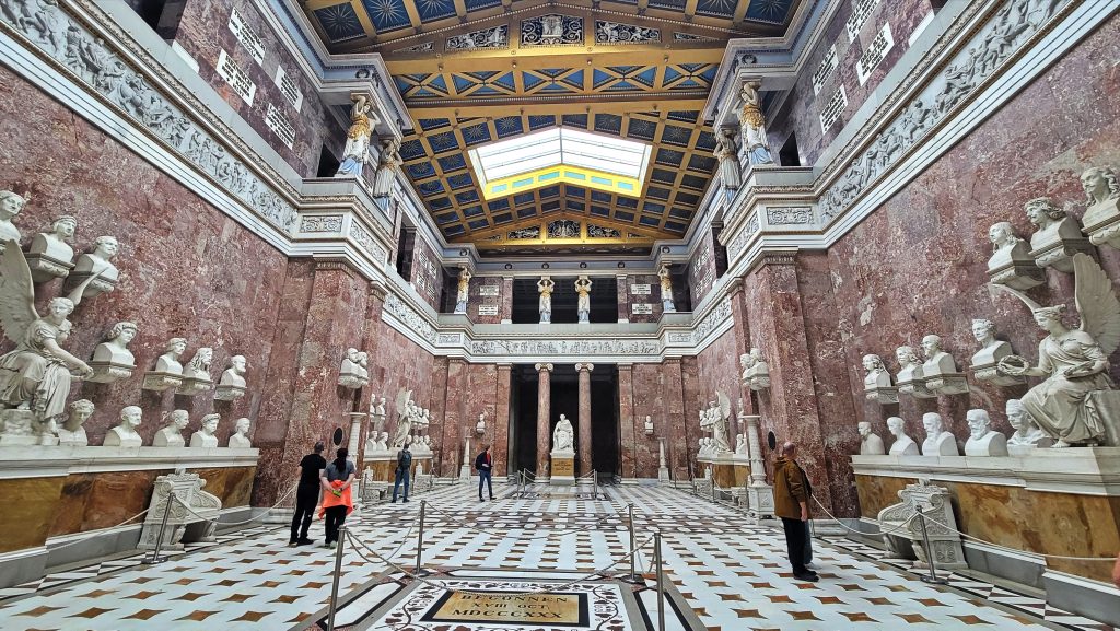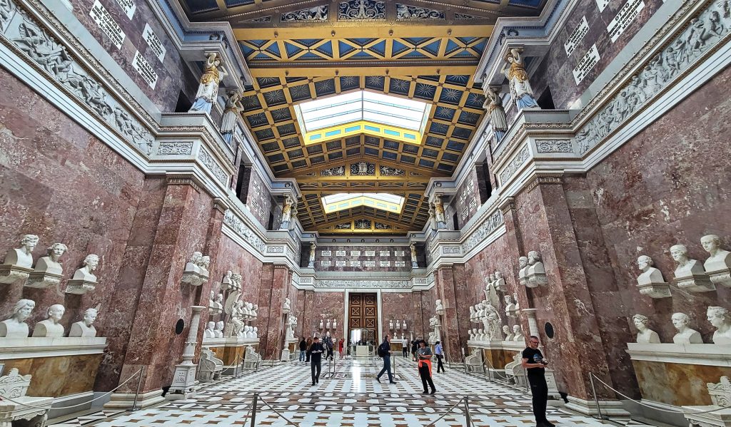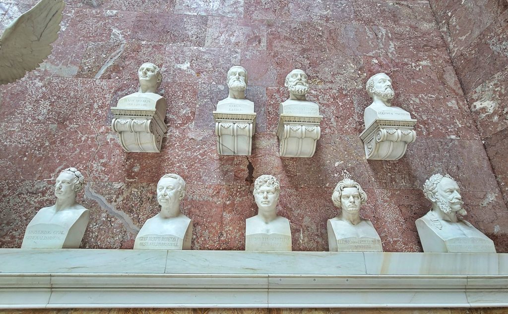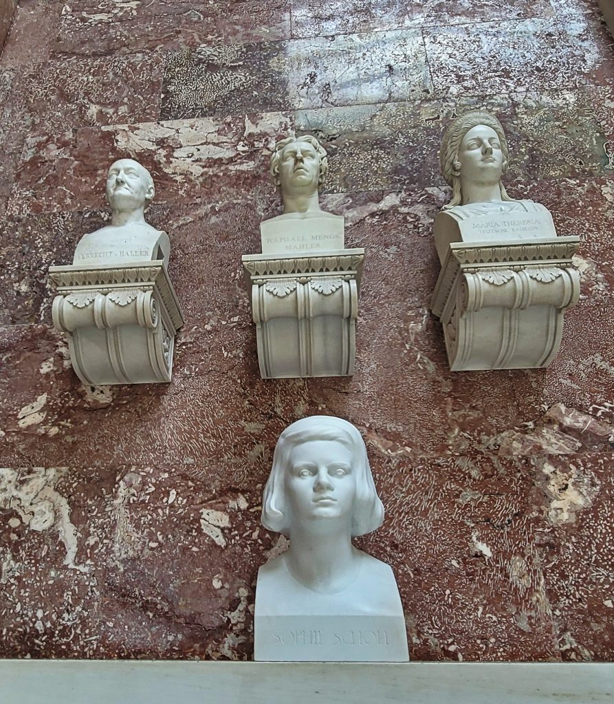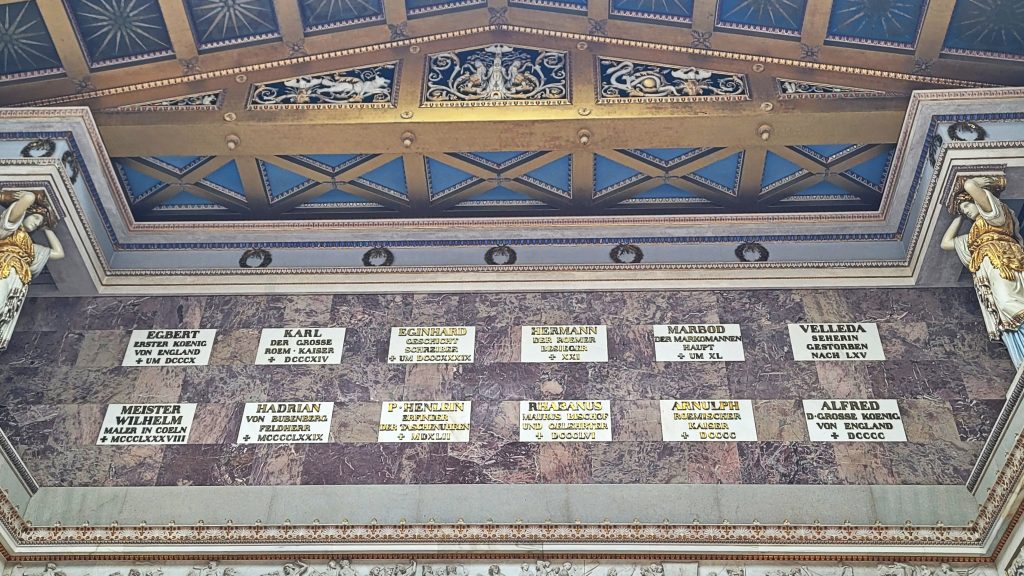 远端顶部墙壁上镶嵌着整齐排列的白色大理石牌匾,肃穆而庄重,用以纪念德语文化圈及欧洲历史上的重要人物。牌匾以拉丁文刻写姓名、头衔,并辅以罗马数字标注生卒年代,如查理曼大帝与阿尔弗雷德大帝等。