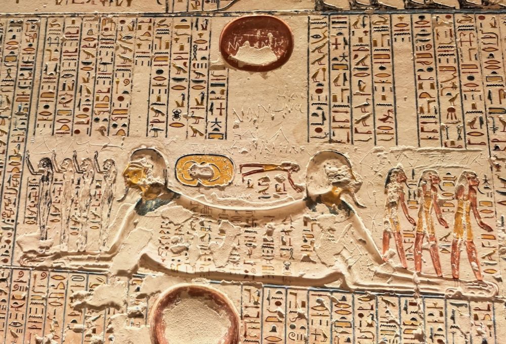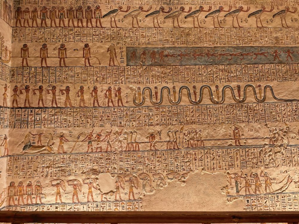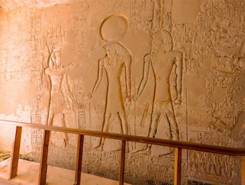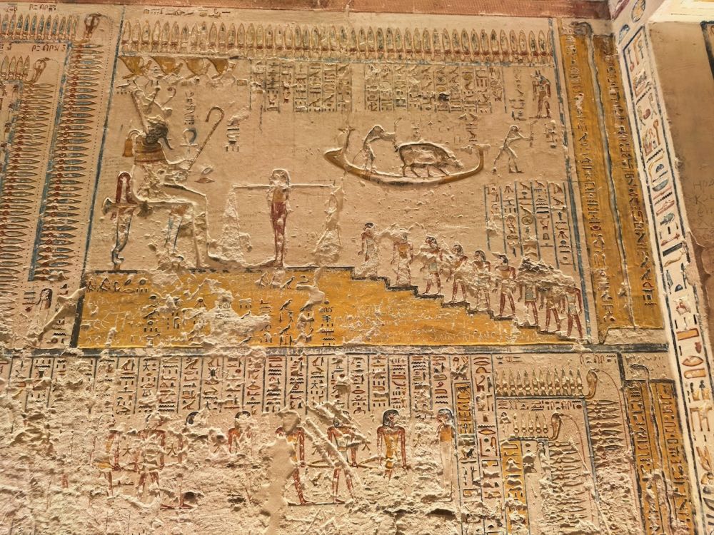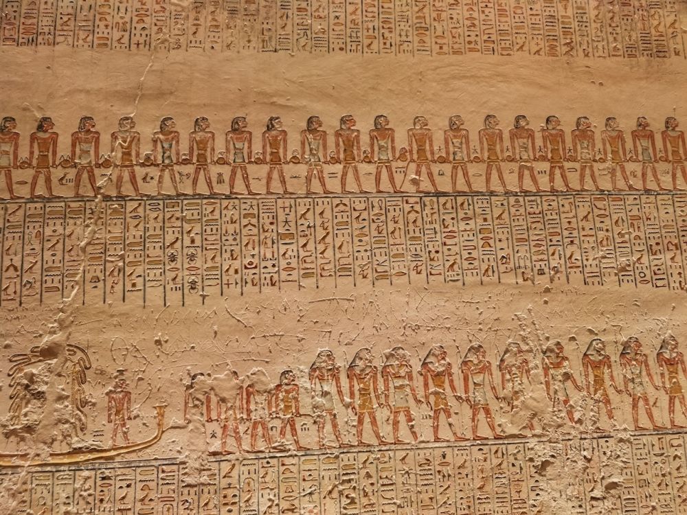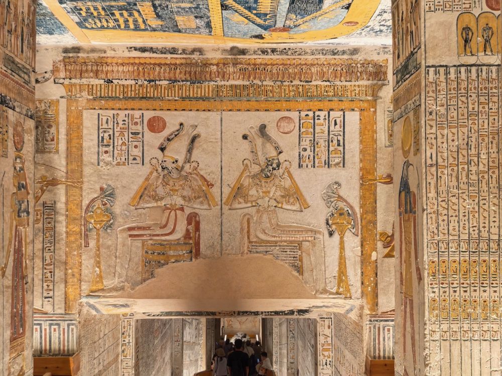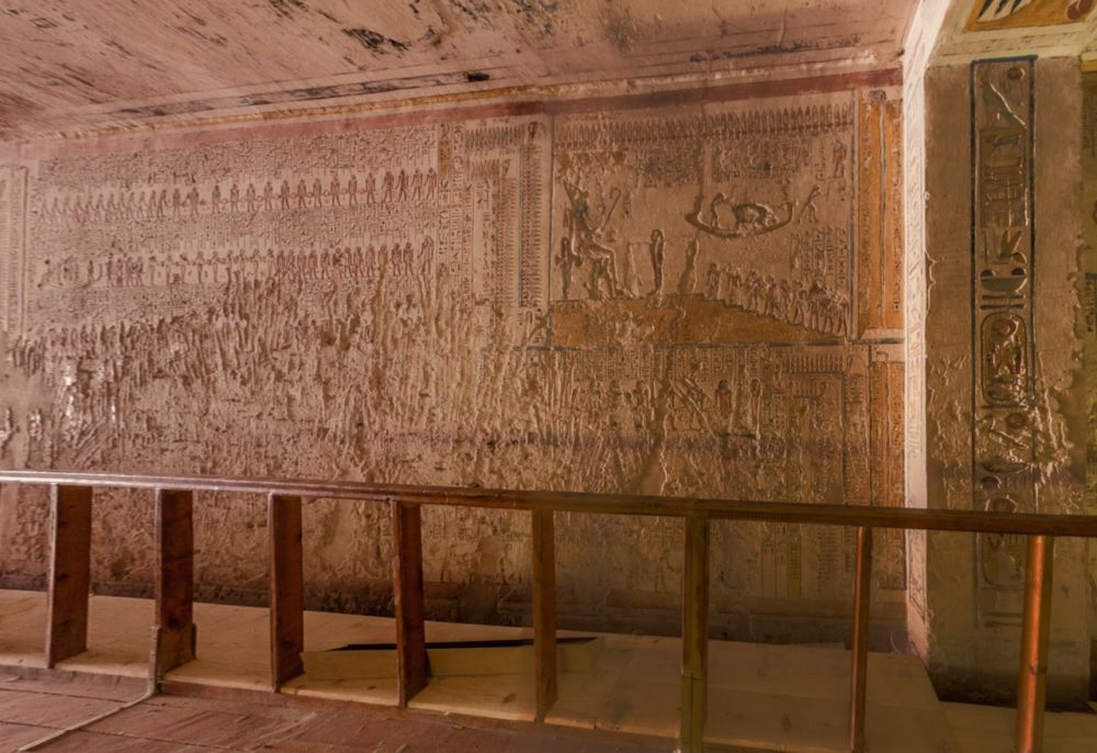 正如前文所讲,拉美西斯三世(Ramesses III)有3位王后,她们各有自己的儿子。拉美西斯三世在晚年遭到第二任王后特雅(Tiye)以及其子彭塔瓦尔(Pentaweret)的暗杀,企图夺取王储之位。篡位没有成功,王后和彭塔瓦尔被赐自杀。原王储顺利继位,这就是拉美西斯四世,他的陵墓我们前面已经介绍过。拉美西斯四世去世,王位由其子拉美西斯五世继承。我们现在要看的陵墓原为拉美西斯五世修建,他亦被安葬于此。但是他的继任也是叔父的拉美西斯六世(既拉美西斯三世的第三位王后伊西斯之子)后来将此墓改为自己的陵墓。鸠占鹊巢,六世将陵墓墙壁上所有五世的王名圈(Cartouche)改成自己的名字,形成帝王谷少有的两任法老同葬在一座陵墓中,这就是KV9。KV9号陵墓是帝王谷3座需单独买票中的一个,它的装饰艺术是整个帝王谷陵墓中风格最为多样化的。陵墓打破传统,以阿拜多斯(Abydos)的欧西里昂神殿(Osireion)为范本,布局包括用壁柱将长廊分为若干段落,长廊在陵墓深处分成两条,一条通向支柱厅,另一条向下通往主墓室。拉美西斯六世下葬二十年后,陵墓就被盗掘。帝王谷几乎所有的陵墓都被盗掘过,盗墓者将财宝盗走,却将木乃伊弃之不顾。拉美西斯五世和六世的木乃伊后被祭师收拾并移至阿蒙霍特普二世(Amenhotep II)陵墓。1898年法国考古学家维克多·劳累特(Vector Loret)在阿蒙霍特普二世陵墓中发现了7具法老木乃伊,这些木乃伊随后运往开罗,如今藏于埃及文明博物馆。