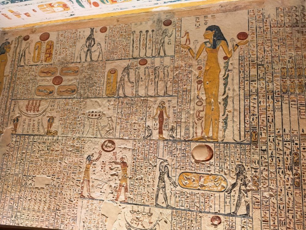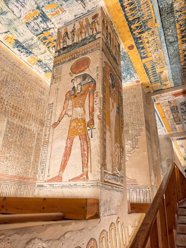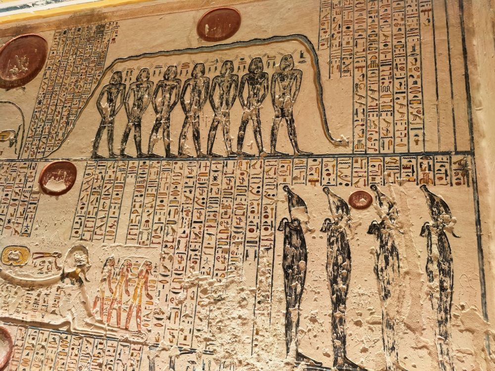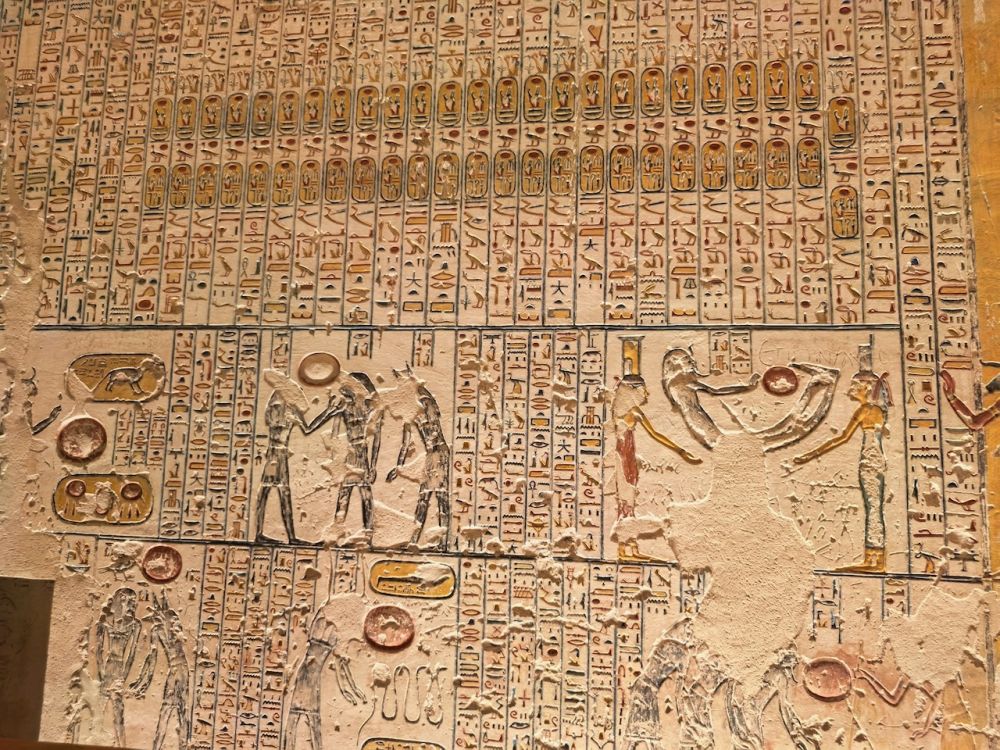 KV9是帝王谷中装饰最完整、内容最丰富的陵墓之一,墓道墙壁密布丧葬文献图文,堪称冥界书画廊。入口处门楣上装饰一个太阳圆盘,内有圣甲虫和公羊头太阳神拉(Ra),两侧为跪姿的伊西斯(Isis)和奈芙蒂斯(Nephthys)女神,以及拉美西斯六世的王名圈,可以看出,他的王名圈是覆盖在五世王名圈之上。进入墓道,首先看到的是拉美西斯六朝拜太阳神拉-霍拉胡提(Ra-Horakhty)以及奥西里斯(Osiris)的场景,这些原本是拉美西斯五世但被六世夺用的。陵墓前半截可看到六世覆盖五世的王名圈,后半截就只有六世自己的王名圈,应该是他后来继续开发的。甬道靠外侧墙壁上的浮雕,损坏较严重,下半截几乎已经全部看不清了。继续向前,壁画的质量越来越好。南墙是完整版的《门之书》,北墙则是几乎完整的《洞穴之书》,KV9是帝王谷中唯一将完整版的《洞穴之书》刻在墙上的陵墓。天花板上绘有天文图像和星座,而后半段是《白昼之书》和《黑夜之书》的双重图像,并由天空女神努特(Nut)延展身体环绕。随着深入墓穴,视觉的景象越来越精彩。前厅可见拉美西斯六世朝拜赫卡乌(Heka)和马亚特(Maat)的图像。赫卡乌是魔术和医疗之神,而马亚特为真理和正义女神。主墓室为一个巨大的岩窟,墙壁上装饰《地球之书》,天花板上是努特女神和《白昼之书》以及《黑夜之书》。壁画精美细腻、色彩鲜艳,而且保存良好,是我们看到的最漂亮的陵墓。这也大概是需要另外收费的理由吧。