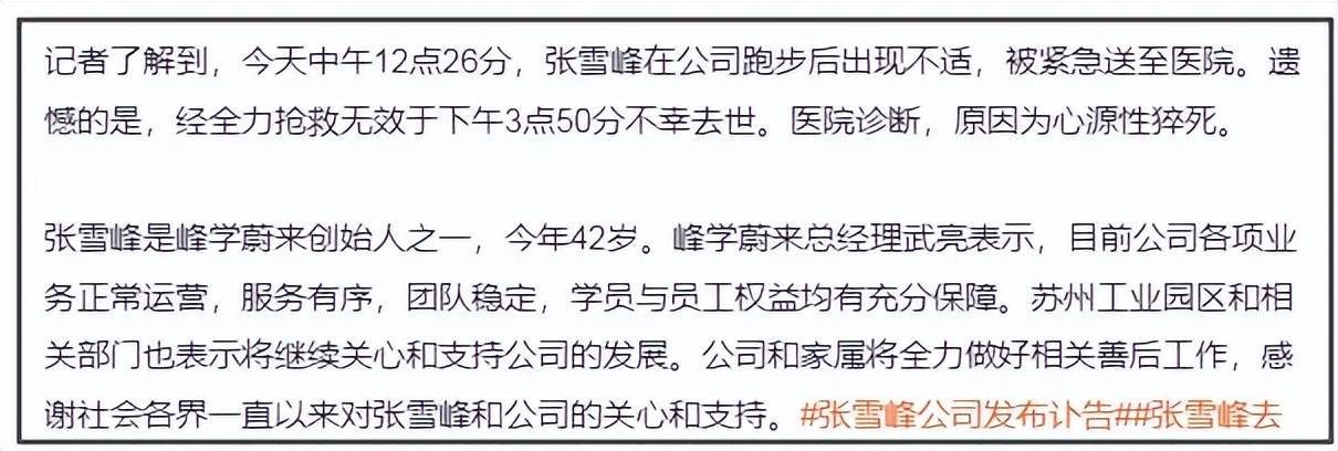 网红教育博主张雪峰离世,年仅41岁,引发网友震惊。据悉,公司讣告显示他是因“心源性猝死”,上午还在直播,中午却因心脏骤停送医。