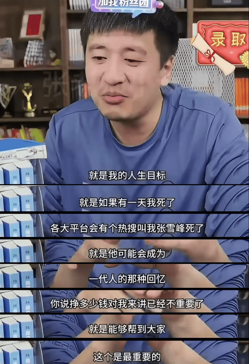 关于死亡,张雪峰曾聊过这个话题,他表示“目标是如果有一天我死了,各大社媒热搜是张雪峰死了”,就此成为一代人的大众回忆,至于挣多少钱不重要,帮大家最重要。
