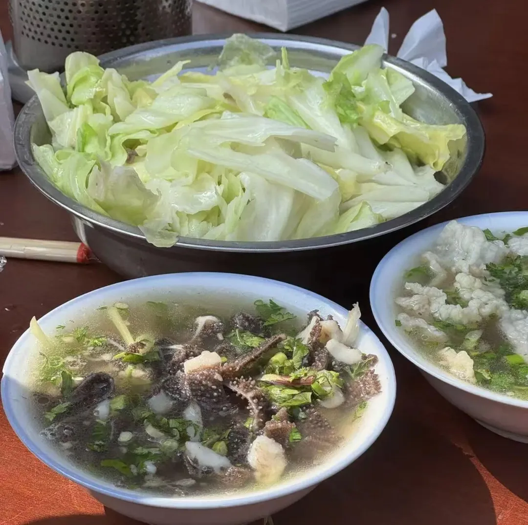 离它不远的粗粮人家东北菜馆,一份东北蘸酱菜24元,描述是“干豆腐、黄瓜、小葱、水萝卜、青萝卜、生菜”,以及 “今天生菜没有,改苦苣”。搭配增强滋味的酱料是“鸡蛋酱”。当然,如果你不要鸡蛋酱里额外的油脂,也可以备注“只要大酱”。人工智能计算后告诉我,600克左右的总分量,卡路里大概会在240~270大卡,其中蛋白质18~21克,脂肪8克左右,碳水18~23克。