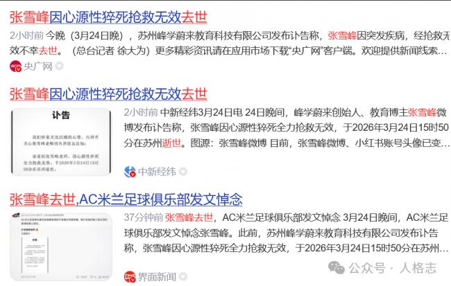 人一旦种下恶果,不能及时进行补救、忏悔、救赎,就注定只会走向绝境。一次次翻车的张雪峰,现在突然因为跑步而猝死,这无异于一个黑色幽默。现在,总结张雪峰的一生,我认为,没能进行及时救赎,是他生命最大的遗憾,也是最大的自害。最后,我特别想说,不论张雪峰此前有过怎样的对错是非,此时,至少应该还他一个本名的称呼。