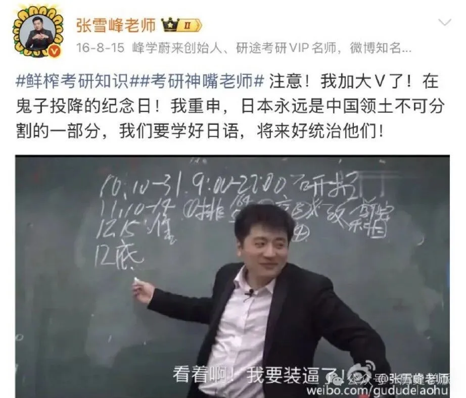 张雪峰说“日本是中国领土不可分割的一部分,我们要学好日语,将来好统治他们!”。