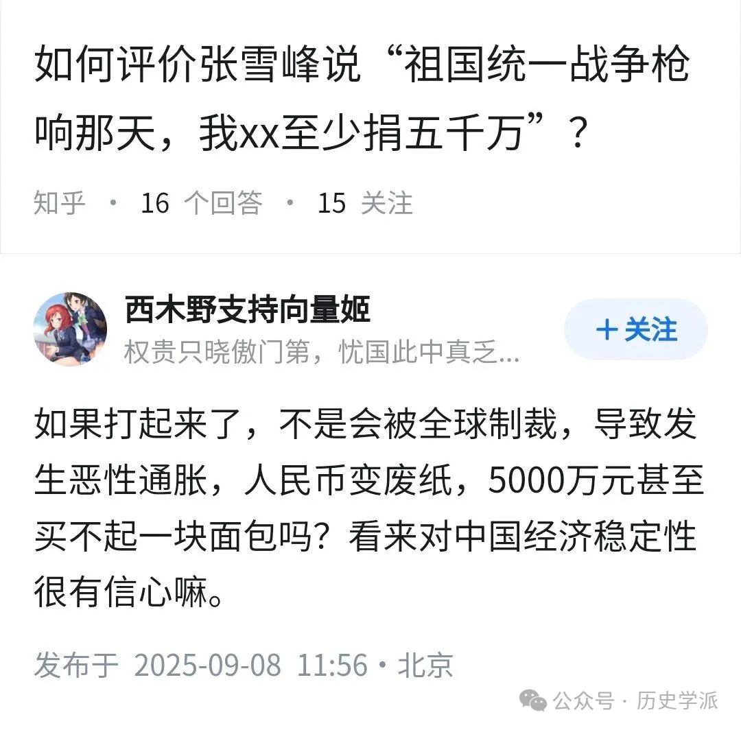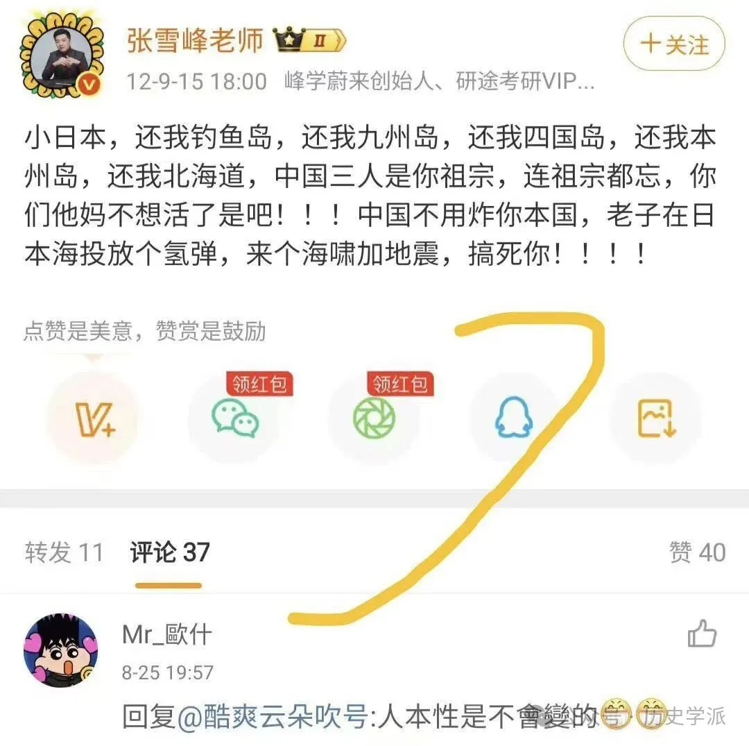 再看张雪峰扬言要核平日本。我甚至觉得你还不如与铁头,铁头是真的敢去日本神社尿尿,而张雪峰虽然说得也很激情澎湃,但总是感觉缺了点义和团式的“勇气”。这叫在最安全的时候最勇敢。