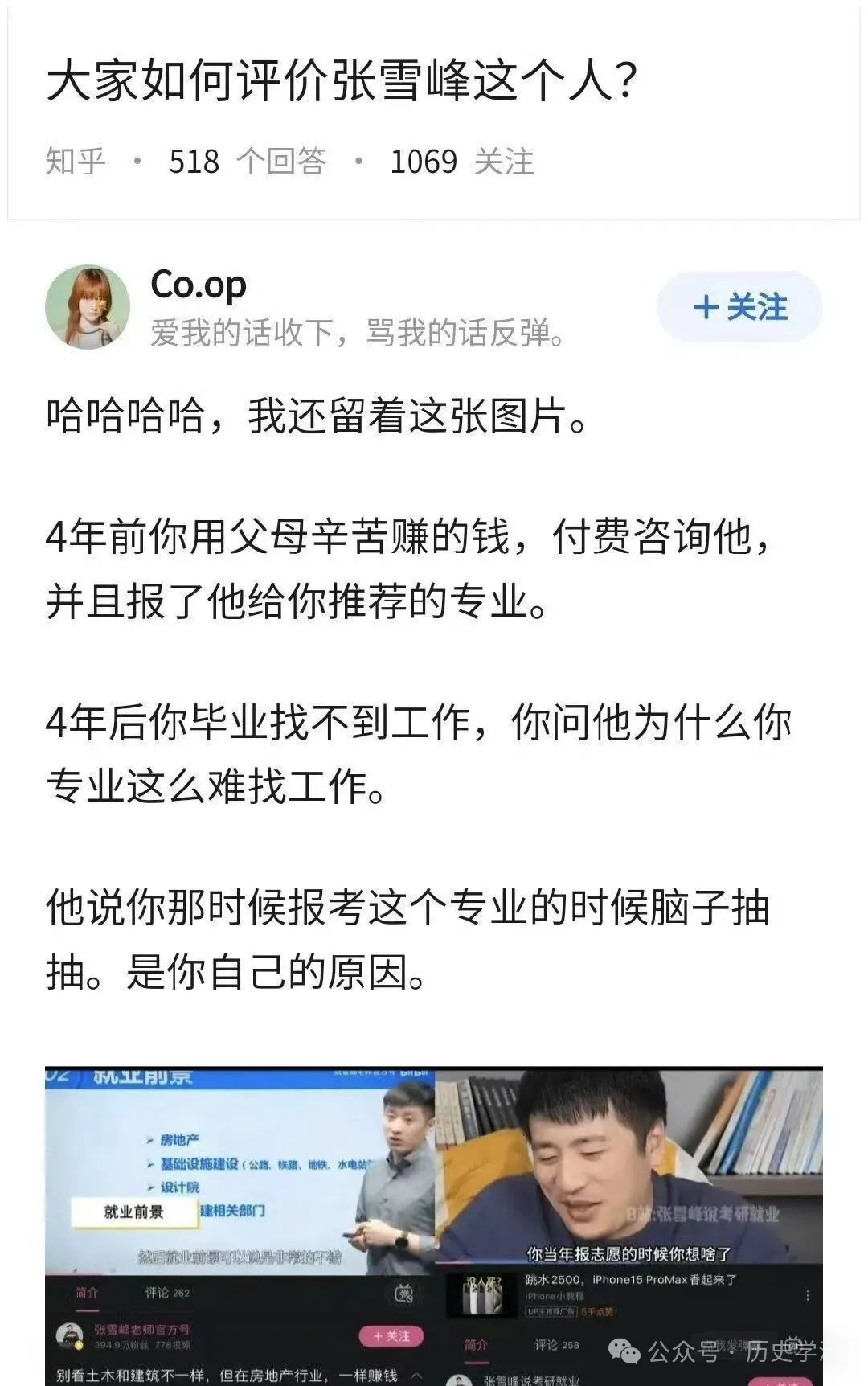 这一点需要大家意识到。换句话说,如果张雪峰只是“故意为之”想混口饭吃,我倒是对他还有点点的同情。但显然,他不是。