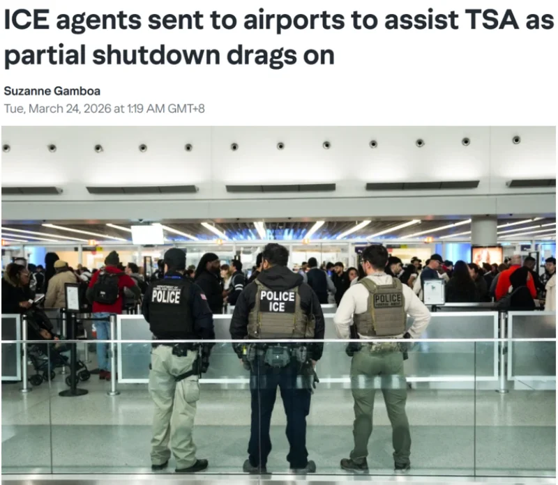 本周一(3月23日),美国移民与海关执法局(ICE)及国土安全部(DHS)人员已部署至14个主要机场: