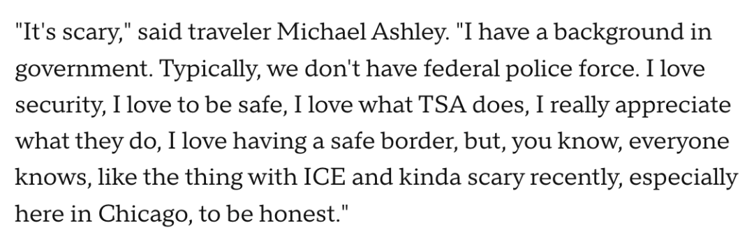 “很可怕”,旅行者迈克尔·阿什利说。“通常我很喜欢安检,喜欢安全,我喜欢 TSA 的工作,我非常感激他们的工作... 但你知道,大家都知道,比如 ICE 的事,最近有点吓人,尤其是在芝加哥,说实话。”