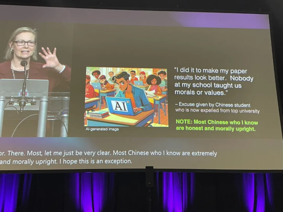 在整个过程中,他唯一明确提及的学生国籍是“中国”。这种特定指向性极强的举例,让人感受到刺眼的歧视意味。