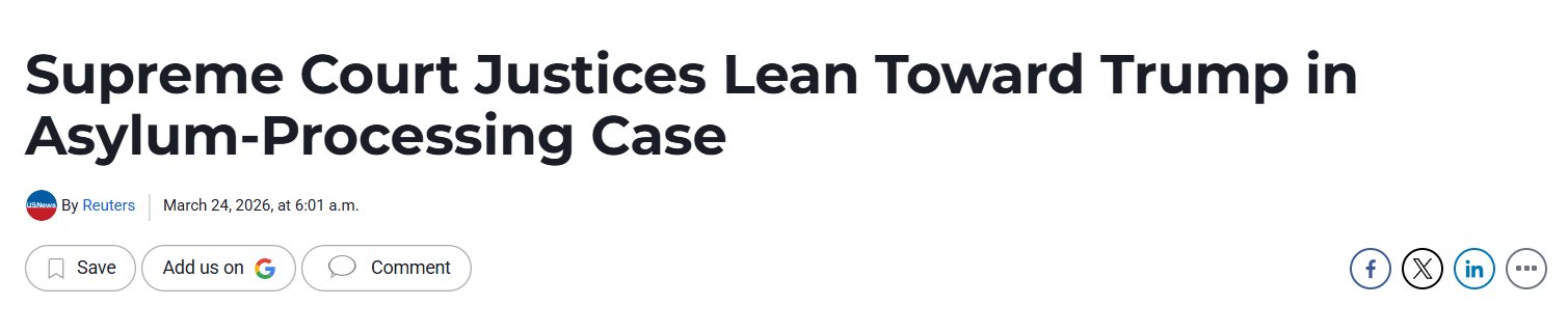 美国最高法院3月24日周二在一场听证中,似乎倾向支持川普政府关于限制庇护申请的立场,