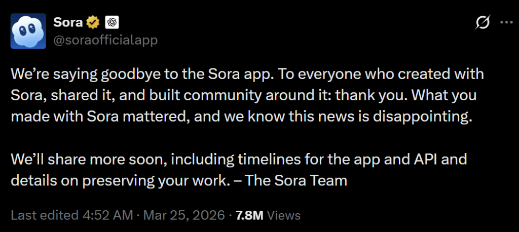 Sora官方账号宣布将停止使用。