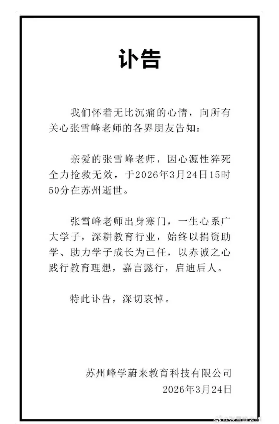 查信息说在抢救,我还抱有侥幸心理,说希望度过难关。直到半小时后,张雪峰心源性猝死的消息真正传来:2026年3月24日15时50分,张雪峰因心源性猝死在苏州离世,年仅41岁!
