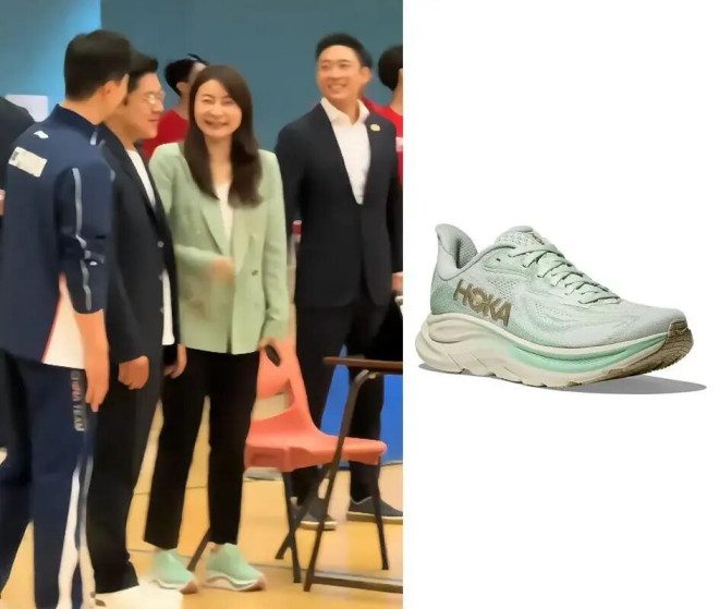 霍家两公子当天都是西装衬衫打扮,休闲又得体。郭晶晶则挑了一件薄荷绿西服,搭配同色系Hoka运动鞋,非常有活力。