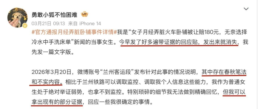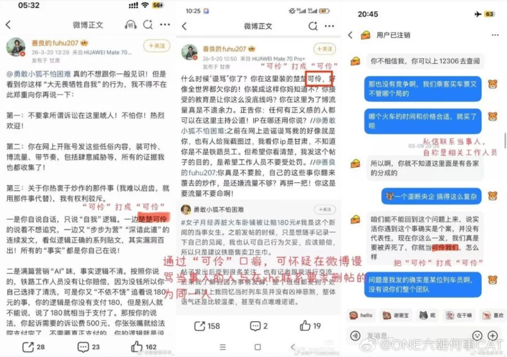 女乘客率先发帖,诉说自己在2025年10月9日遭遇的不平事。@兰州客运段回复,双方一来一回显得很公平。不过此公平的前提是,@兰州客运段实话实说。如果它没有说实话,甚至只说了部分,就不可能是一场公平的对决。道理很简单,相比较于一个普通的个体,@兰州客运段拥有强大的体量,这种体量不仅体现在“声音大”“权威性”,还体现在拥有众多的帮手。因此,也就出现了女乘客被网暴的一幕。