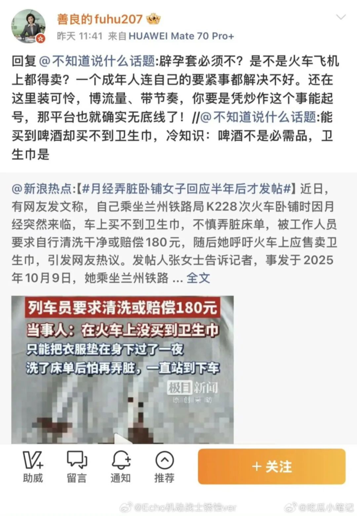 不愿意去探讨火车上可以卖啤酒、火腿、盒饭,偏偏一方小小的卫生巾却没有,体现了公共服务意识的不完善。去谈这个很没有意思,显得是个外乡人;特别是跟网暴者去谈,简直对牛弹琴。想要谈的是,这场“辩论”的不对称性。